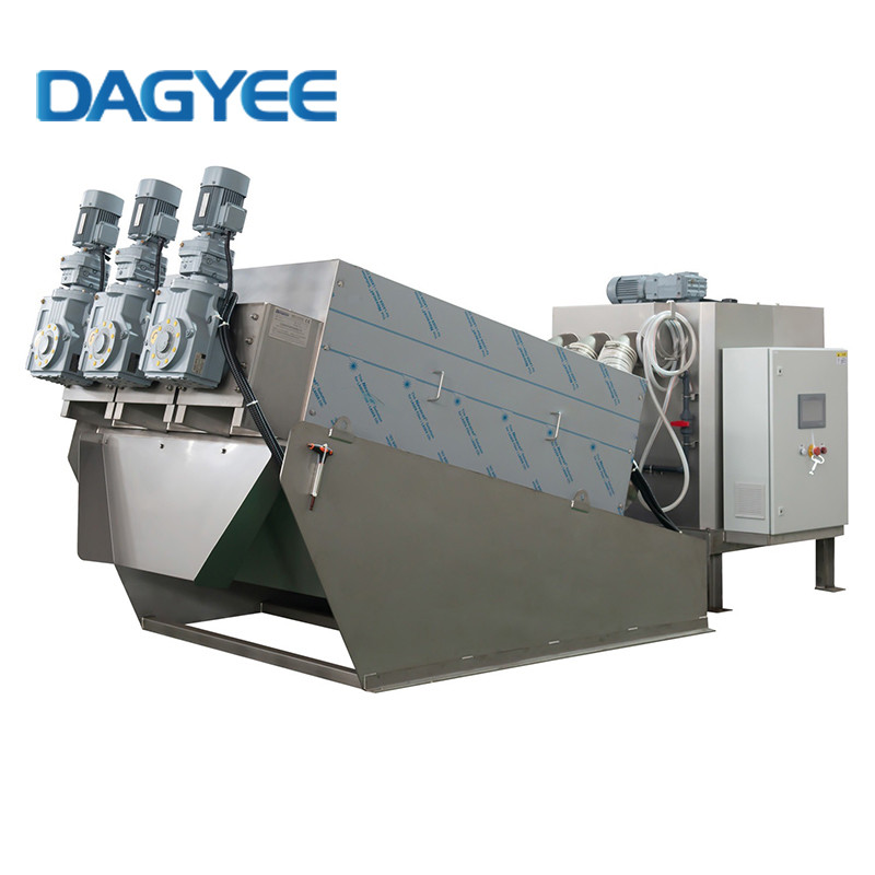 Entwässerung: Der verdickte Schlamm bewegt sich vorwärts ununterbrochen von der Verdickungszone in Richtung zur Entwässerungszone. Mit der Neigung des Schraubenwellenfadens, der schmaler und schmaler erhält, erhöht der Druck in der Filterkammer höheres und höheres. Zusätzlich zum Druck, der durch die Gegendruckplatte erzeugt wird, wird der Schlamm groß gedrückt und trockenere Schlammkuchen produzieren;