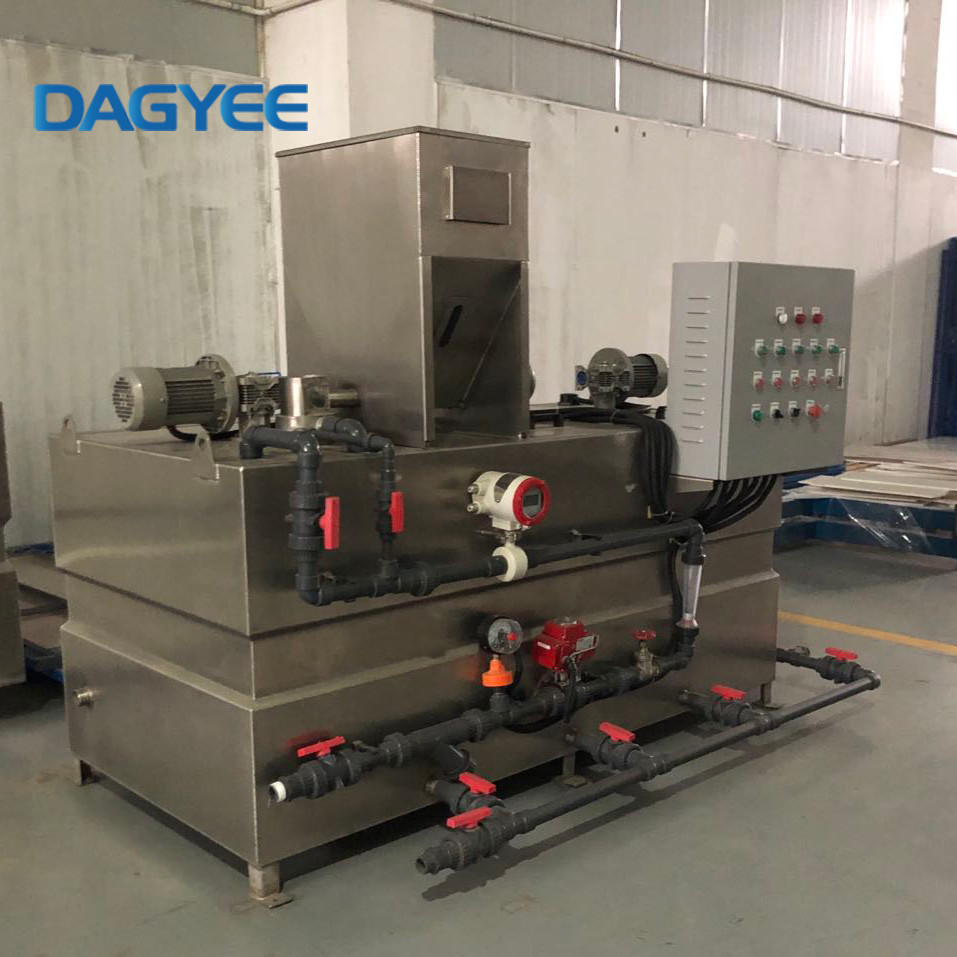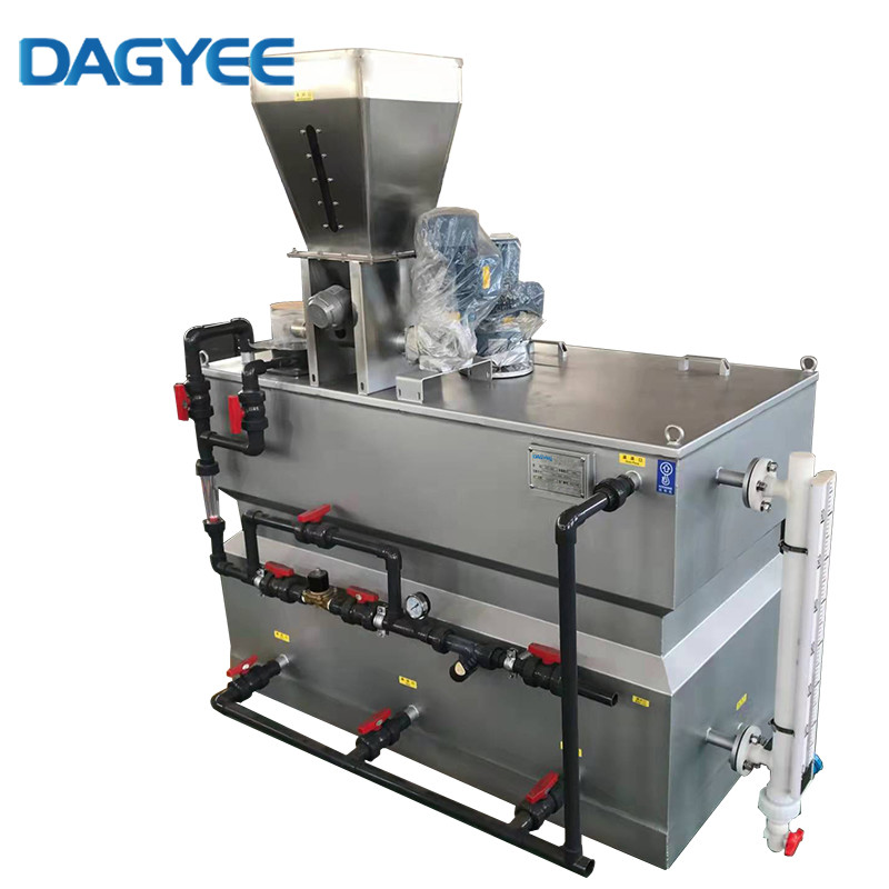 Das Polymerlösegerät besteht aus einem Vor-Socken-Gerät, einem Tank und 3 Mischgeräten.Die 3 Tanks sind vorgefertigte Mischtank, ein homogener Schleifbehälter und ein Lösungsspeicher, in dem ein Mischer vorhanden ist, um die Homogenität zu gewährleisten.